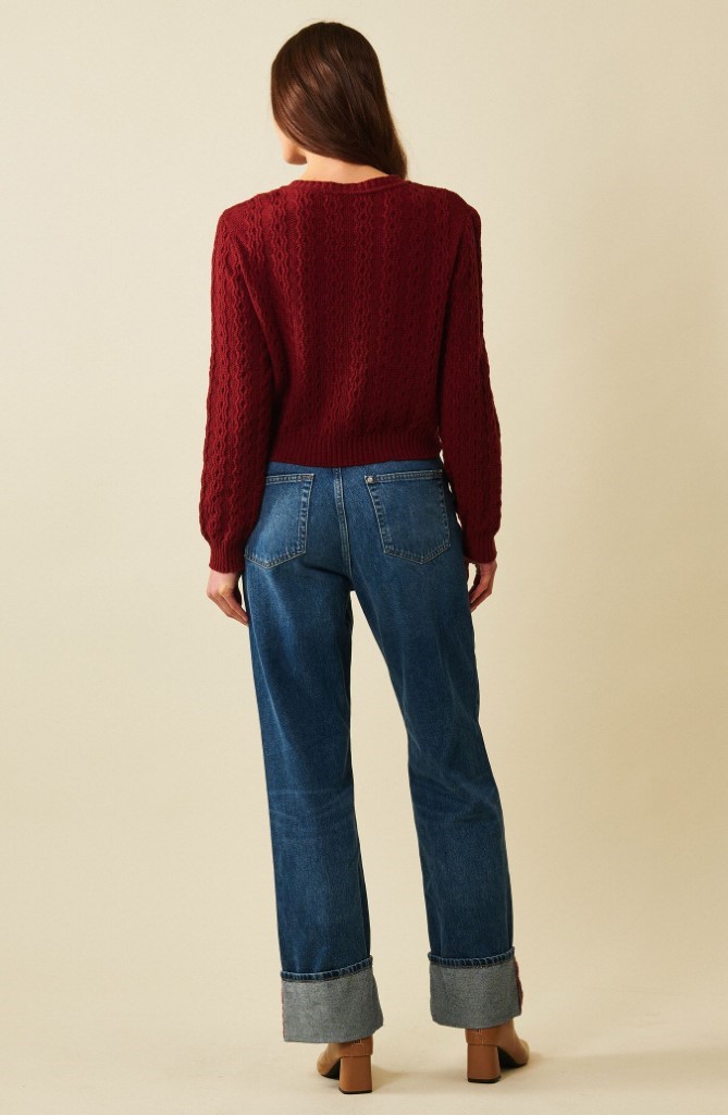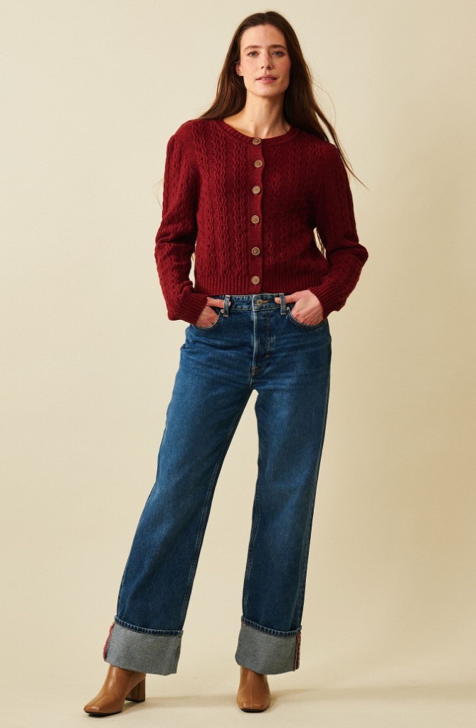 – Rett og romslig fasong. Ermene avsluttes med en strikket mansjett. Vakker kabelstrikk.