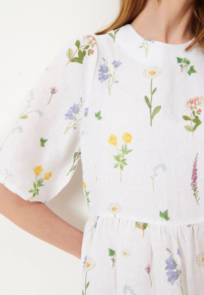Fabienne kjole i 100% lin med blomstermønster i pastellfarge