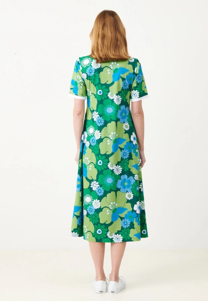 – Utringningen er kantet med hvitt, det samme er de korte ermene. Kjolen slutter på leggen – litt avhengig av hvor lange ben du har!