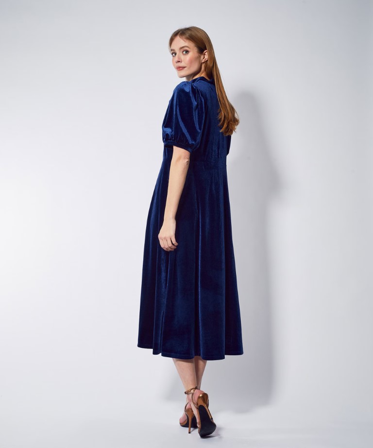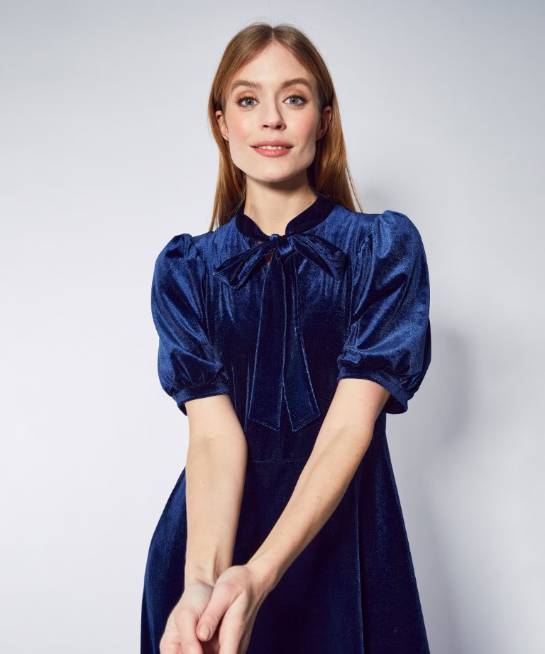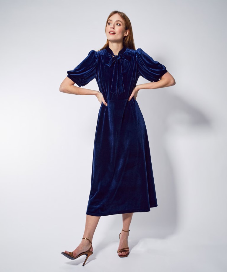 Marineblå Selda festkjole med knytesløyfe og puffermer