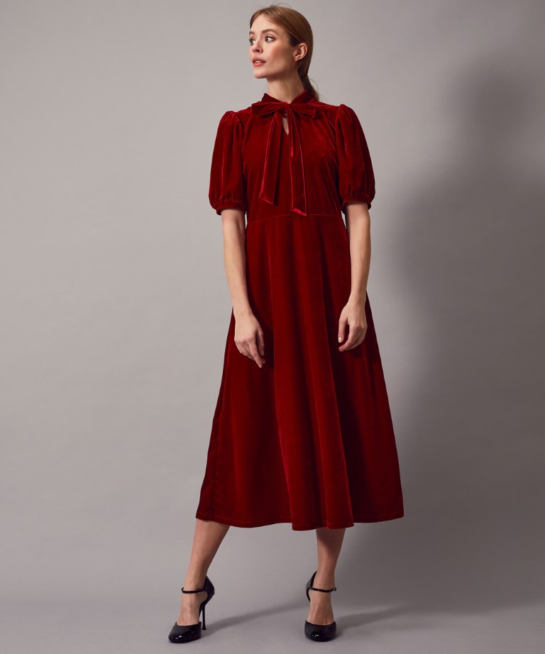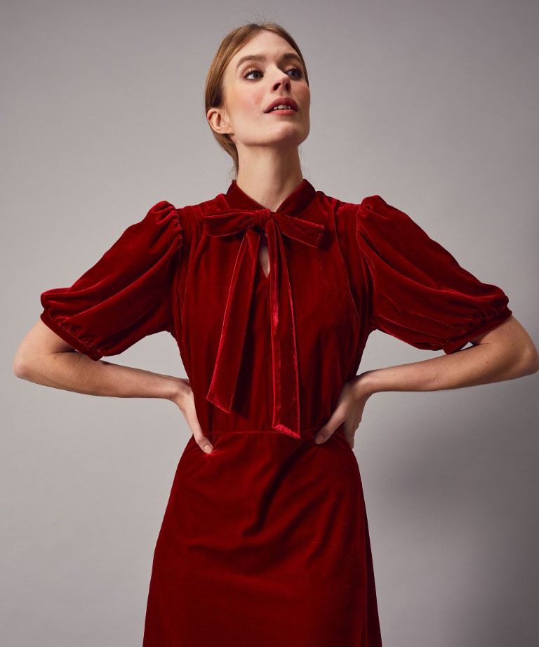 – Vakker og feminin kjole med sjenerøs sløyfe i halsen. Korte puffermer med mansjett nederst som slutter rett ved albuen.