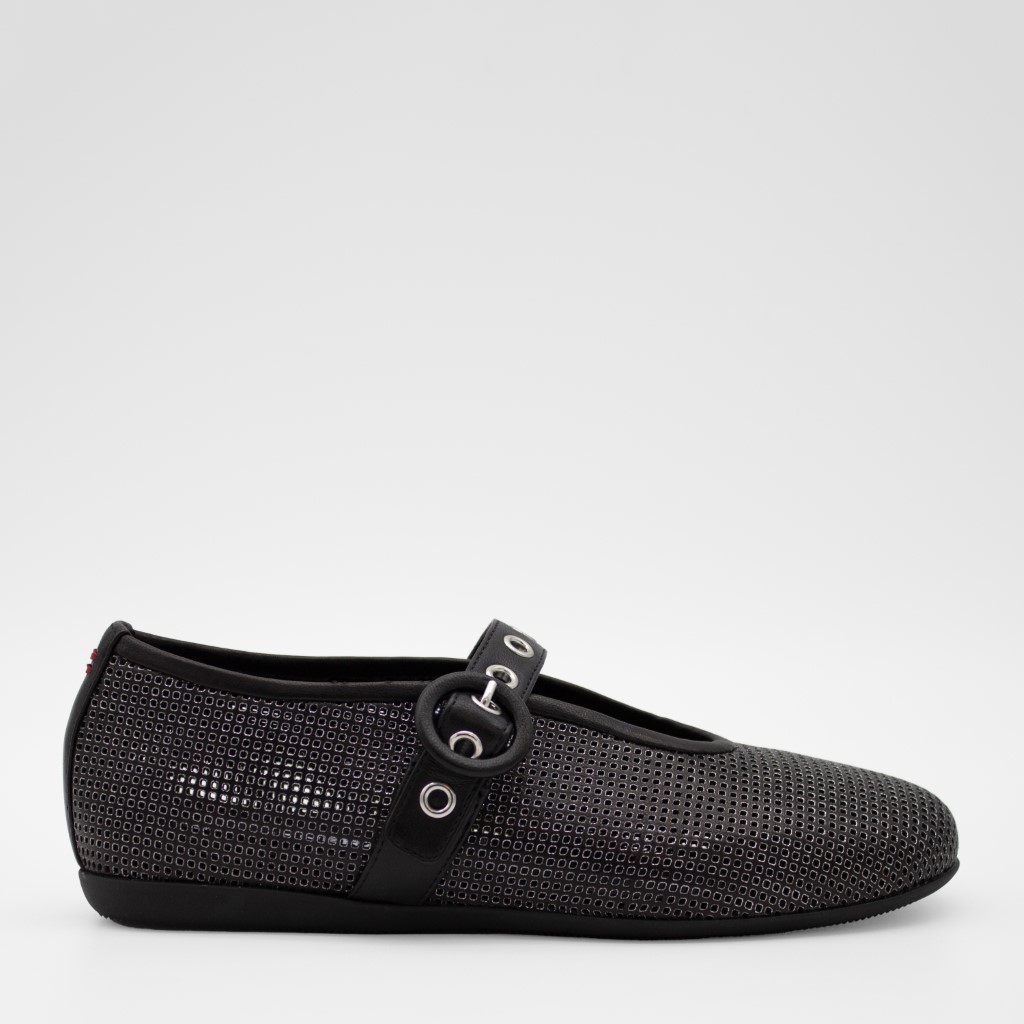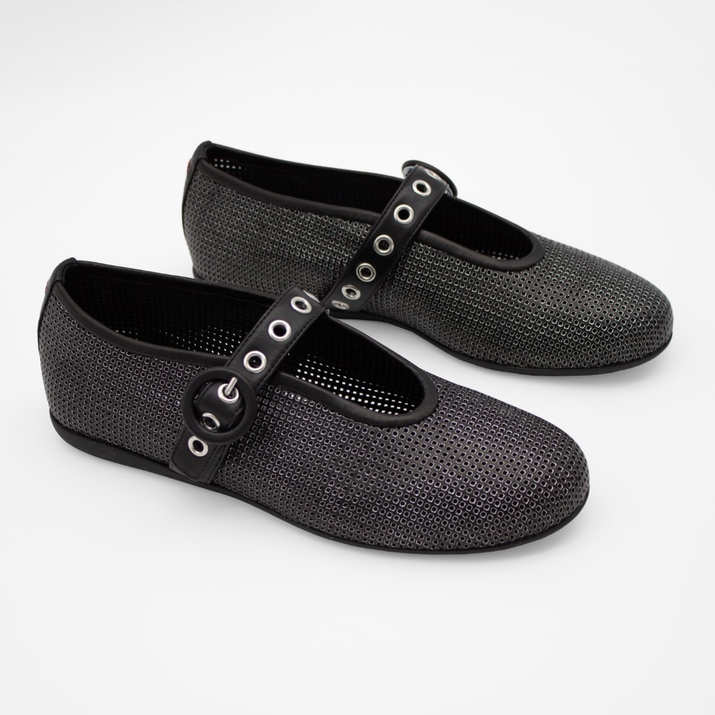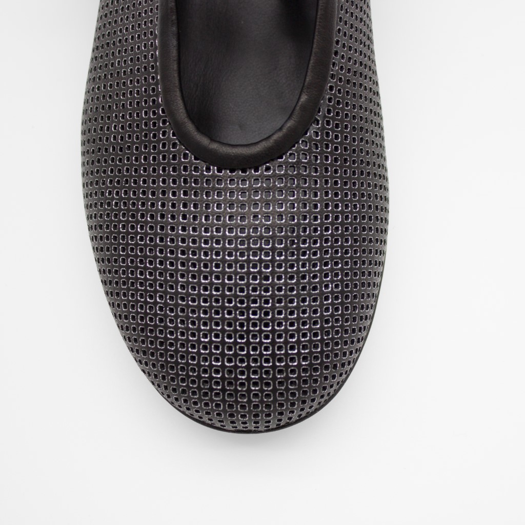 Forseggjort ballerinasko i perforert metallisk skinn
