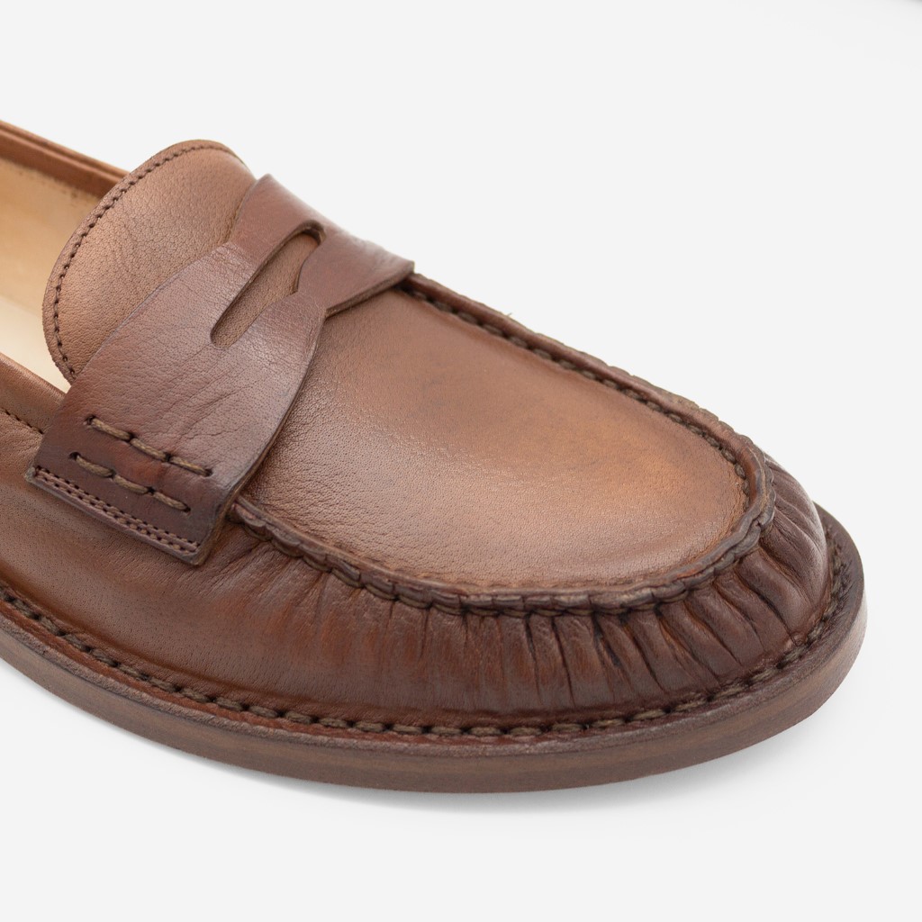 – Mykt skinn som former seg perfekt etter foten. Litt kraftigere såle enn den vanlige mokkasinen fra Pantanetti.
