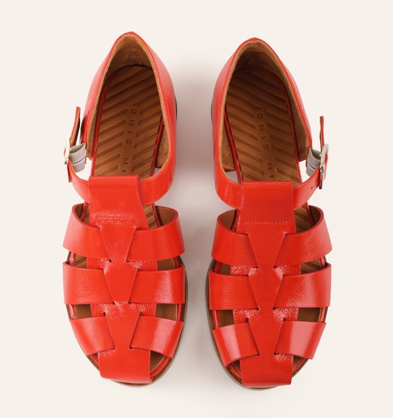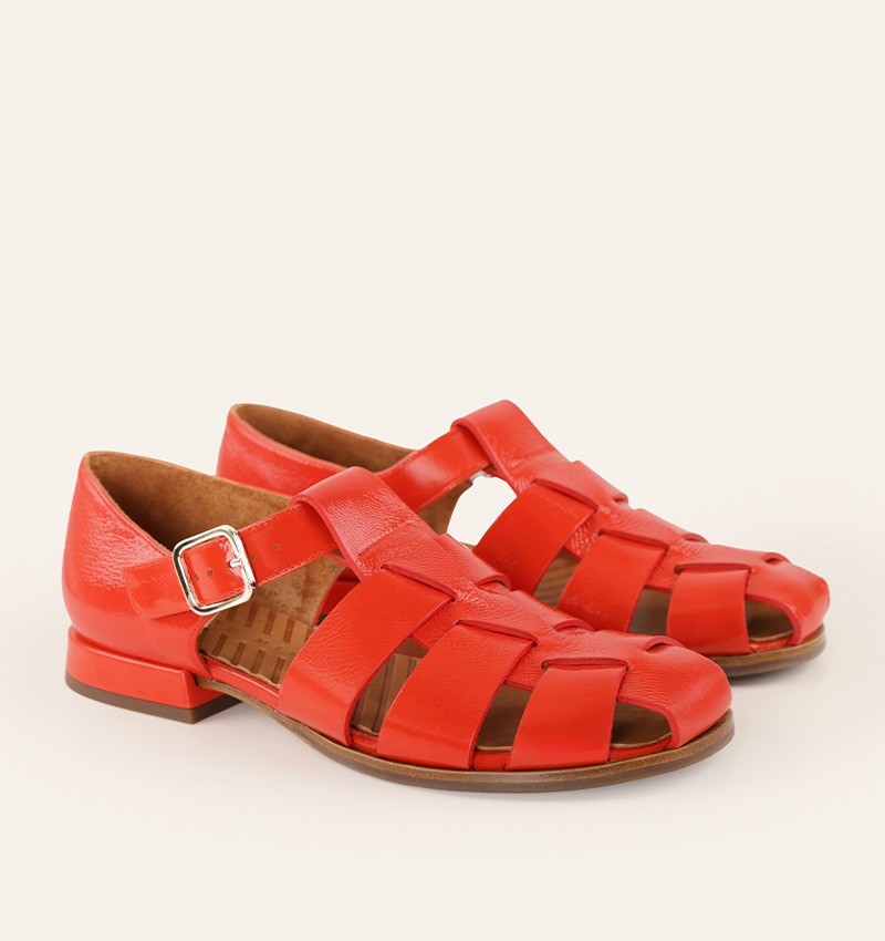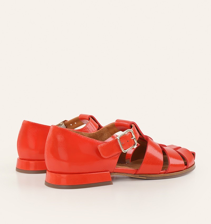 – Myk skinnlakk i en herlig rød farge som former seg perfekt etter foten. En nostaligisk og leken modell, som bringer tankene tilbake til det man kaller en sandalsko – åpen og lukket på samme tid.