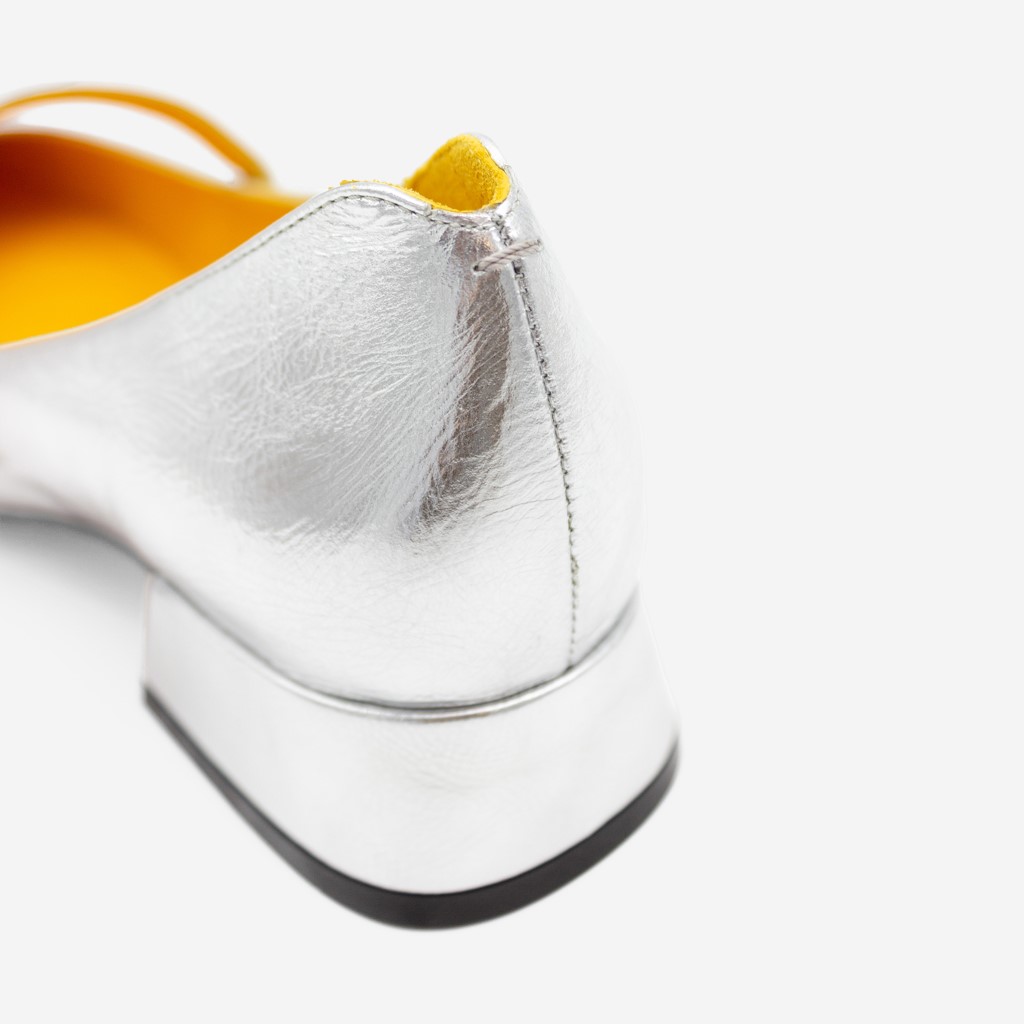 – Festes over vristen med en rem med metallspenne. Modellen har en asymmetrisk skjæring, og en fin V-detalj bak på hælen.